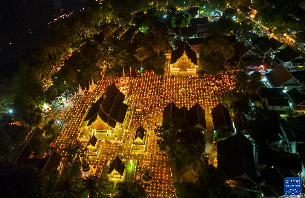 10月11日晚,人們在老撾瑯勃拉邦古城點亮花燈(無人機照片)。
