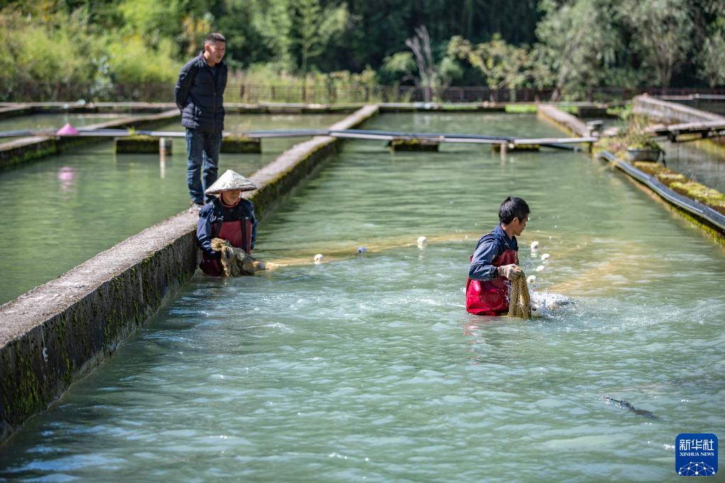 10月11日,在重慶市城口縣蓼子鄉明安村冷水魚產業基地,工作人員在捕撈準備出售的虹鱒魚。