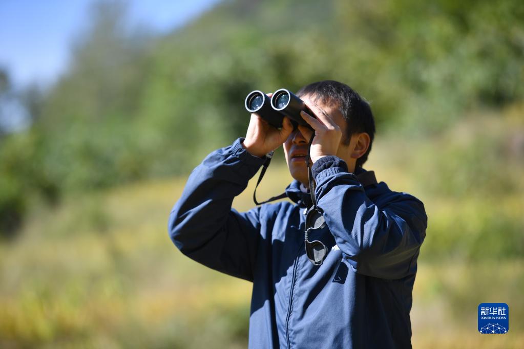 陜西寧陜朱鹮野化放飛基地管理站站長李夏在觀察朱鹮的日常狀況(10月10日攝)。 新華社記者邵瑞攝