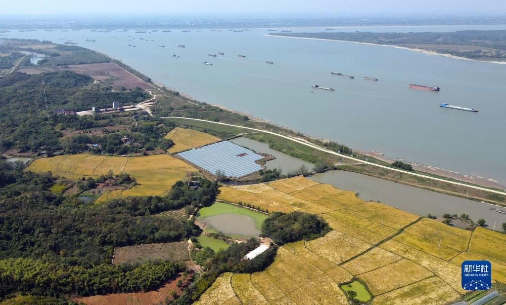 金秋時節,在長江沿岸的安徽省蕪湖市繁昌區,大片水稻田陸續迎來豐收,當地農民搶抓晴好天氣收割水稻。金黃的稻田、繁忙的長江主航道和田間地頭穿梭的收割機,共同組成一幅美麗的江畔秋收圖景。