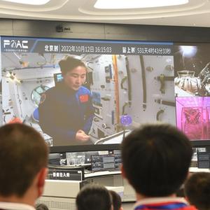 10月12日,在中科院空間應用工程與技術中心地面主課堂,學生收看“天宮課堂”第三課。