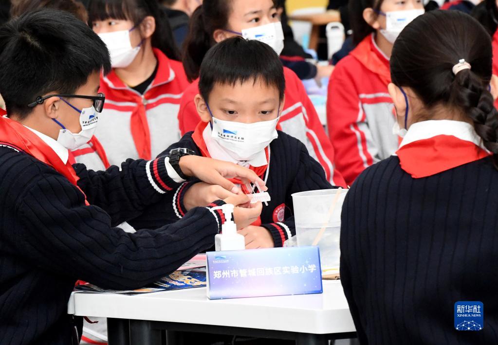 10月12日,學生在河南省科技館收看“天宮課堂”第三課時做實驗。 新華社記者 李安 攝