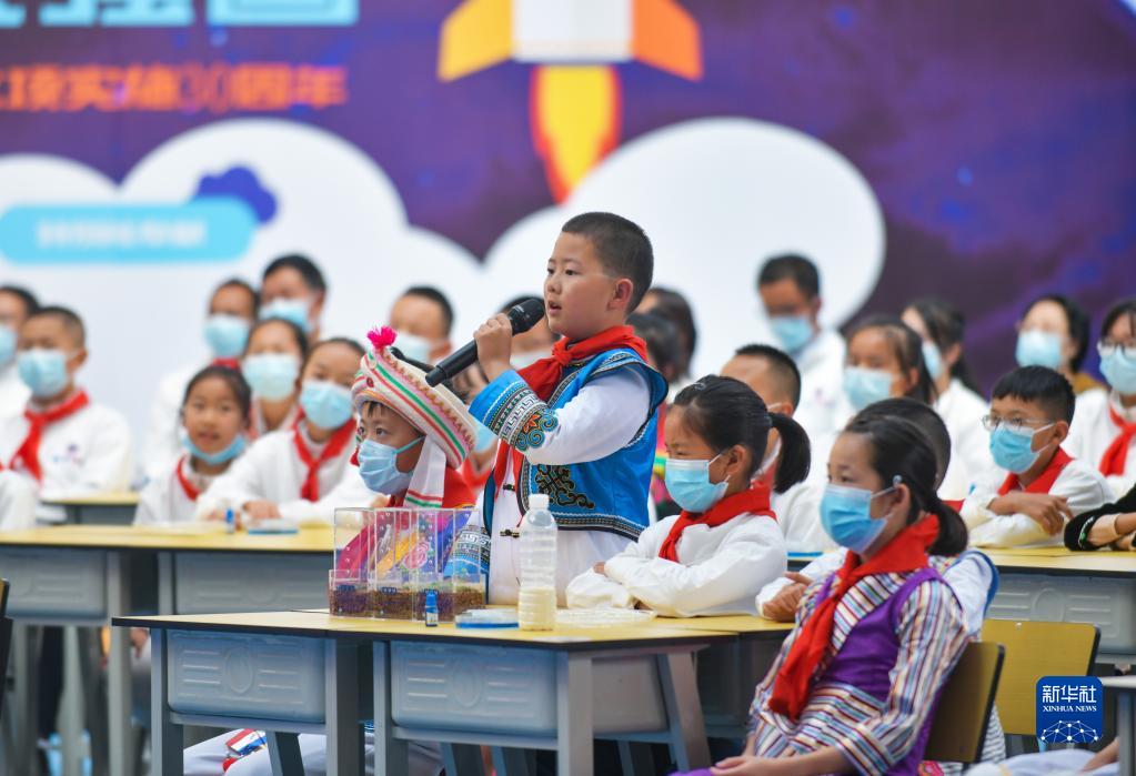 10月12日,在云南省大理新世紀中學,收看“天宮課堂”第三課的學生介紹地面種植的擬南芥生長情況。 新華社記者 陳欣波 攝