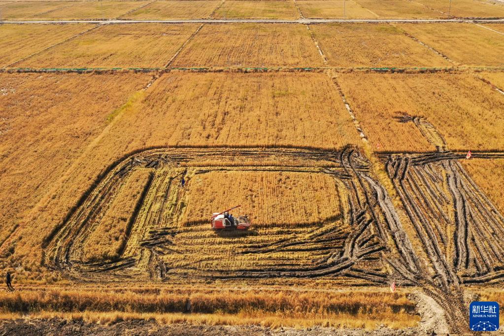 在大安市海坨鄉鹽堿地生態修復治理示范基地,農民駕駛收割機收割水稻(無人機照片,10月12日攝)。