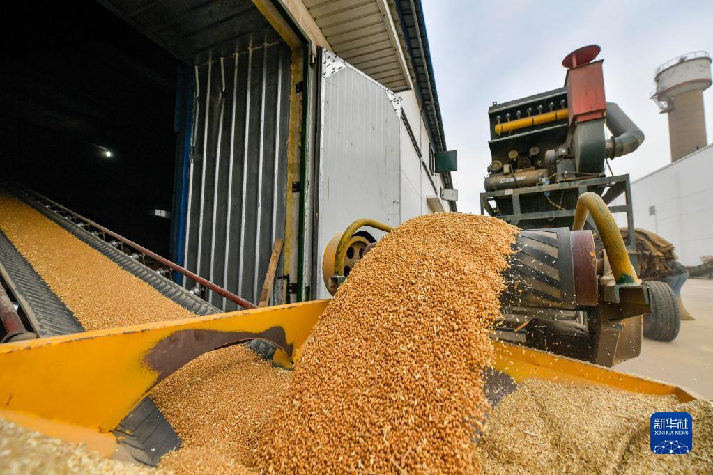 10月12日,在中央儲備糧天津東麗直屬庫有限公司大港分公司,小麥被傳送帶轉運至倉房內。