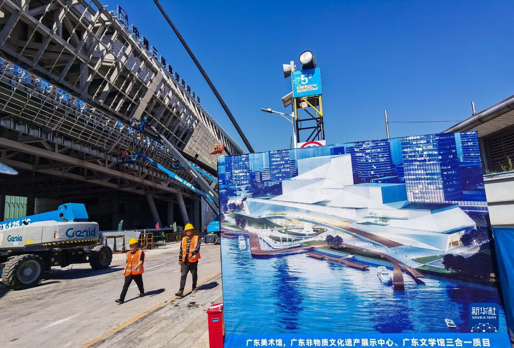 建設者從廣東美術館、廣東非物質文化遺產展示中心、廣東文學館“三館合一”項目效果圖旁經過(10月12日攝)。