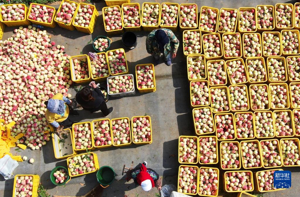 10月13日,在山東萊西市南墅鎮袁家村,果農在分揀冬桃(無人機照片)。
