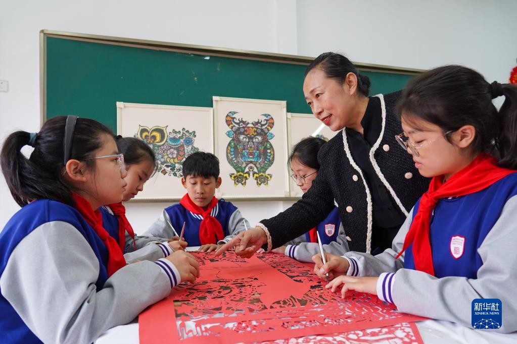 10月13日,張莊小學學生在老師指導下學習剪紙。