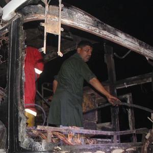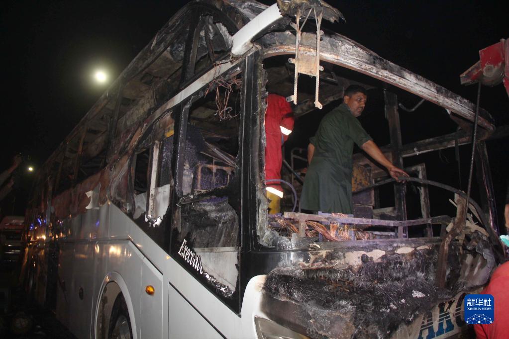 10月13日,救援人員在巴基斯坦信德省賈赫舒洛地區檢查燒毀的客車。