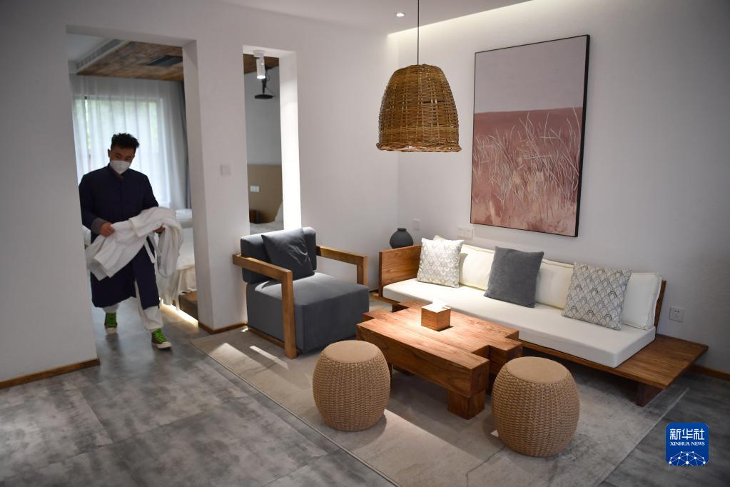 2022年10月13日,西安市長安區子午街道抱龍村一家民宿的管家在整理房間。