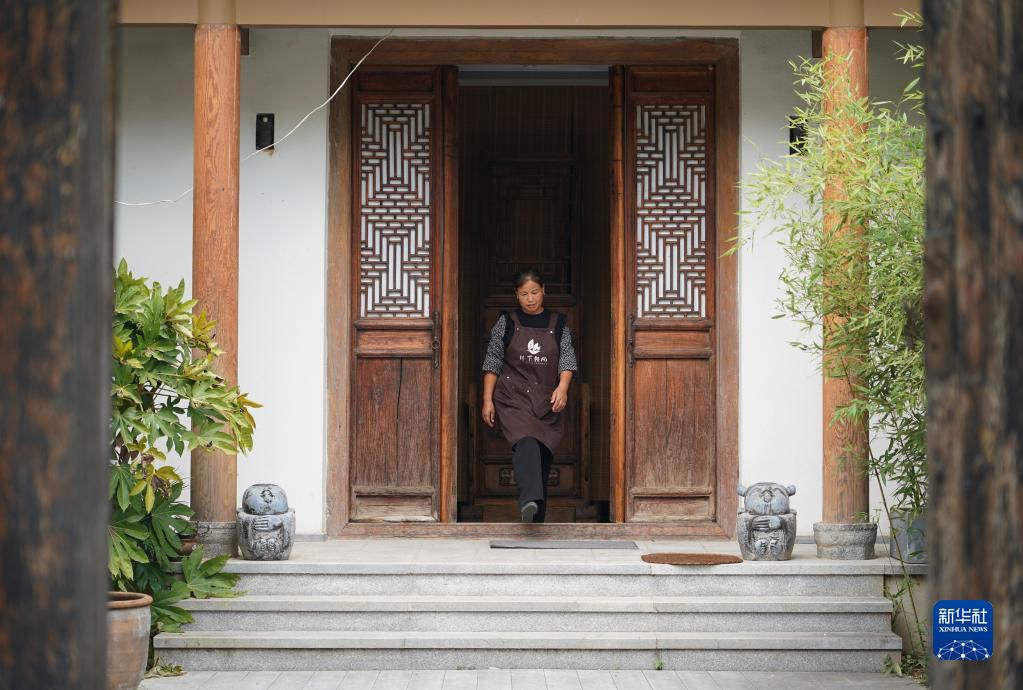 西安市藍田縣小寨鎮董嶺村村民劉春玲在村里一處民宿內忙碌(2022年9月14日攝)。