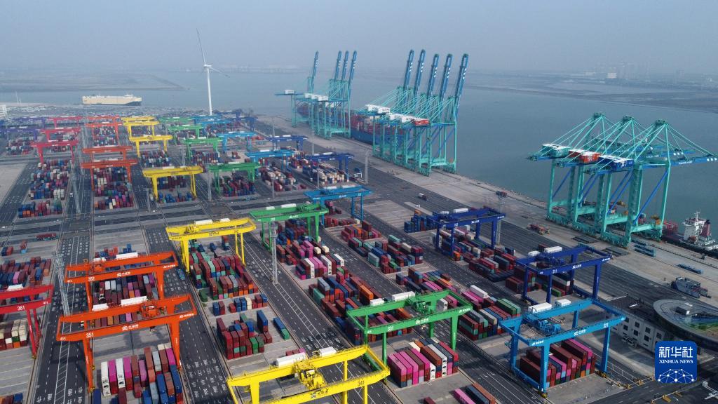 這是10月13日拍攝的天津港北疆港區C段智能化集裝箱碼頭(無人機照片)。 新華社記者 趙子碩 攝