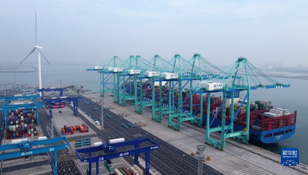 10月13日,“中遠海運天秤座”貨輪??吭谔旖蚋郾苯蹍^C段智能化集裝箱碼頭進行裝卸作業(無人機照片)。 新華社記者 趙子碩 攝