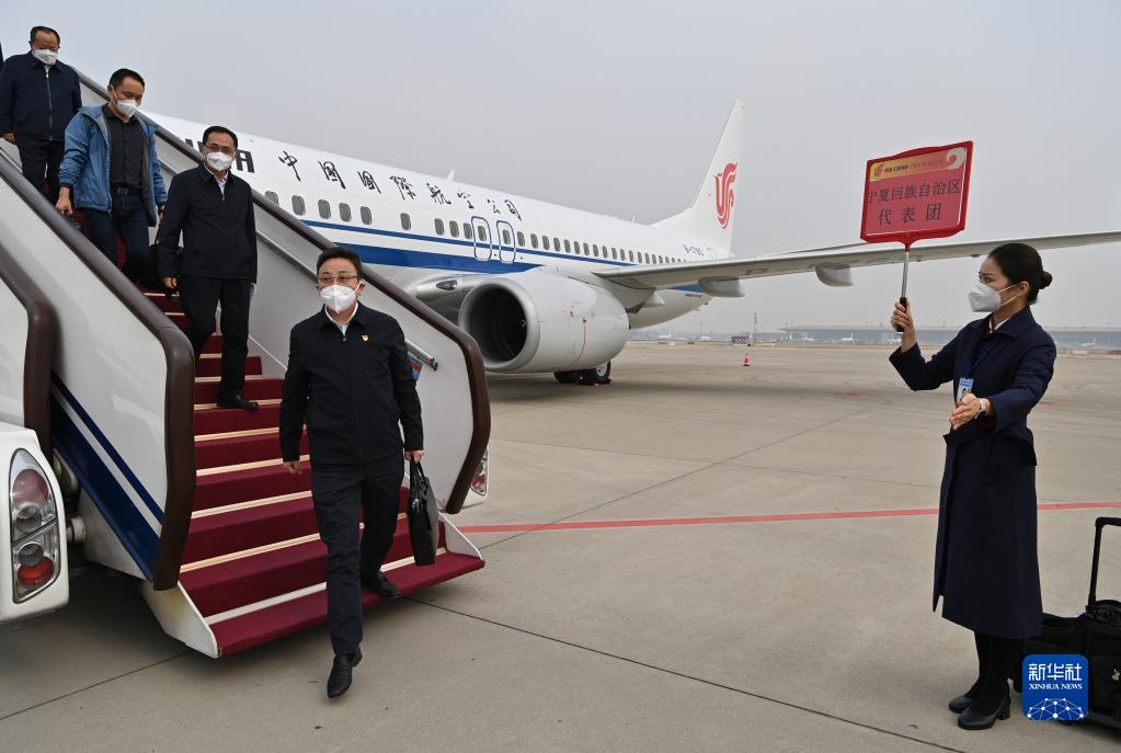 10月13日,來自寧夏回族自治區的黨的二十大代表乘飛機抵達北京首都國際機場。新華社記者 陳益宸 攝