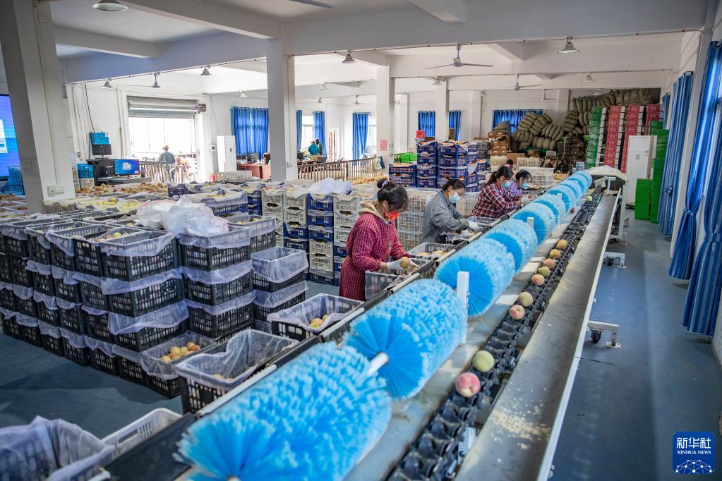 10月13日,在重慶市巫溪縣峰靈鎮,工作人員在分選包裝車間內對冬桃進行分級。