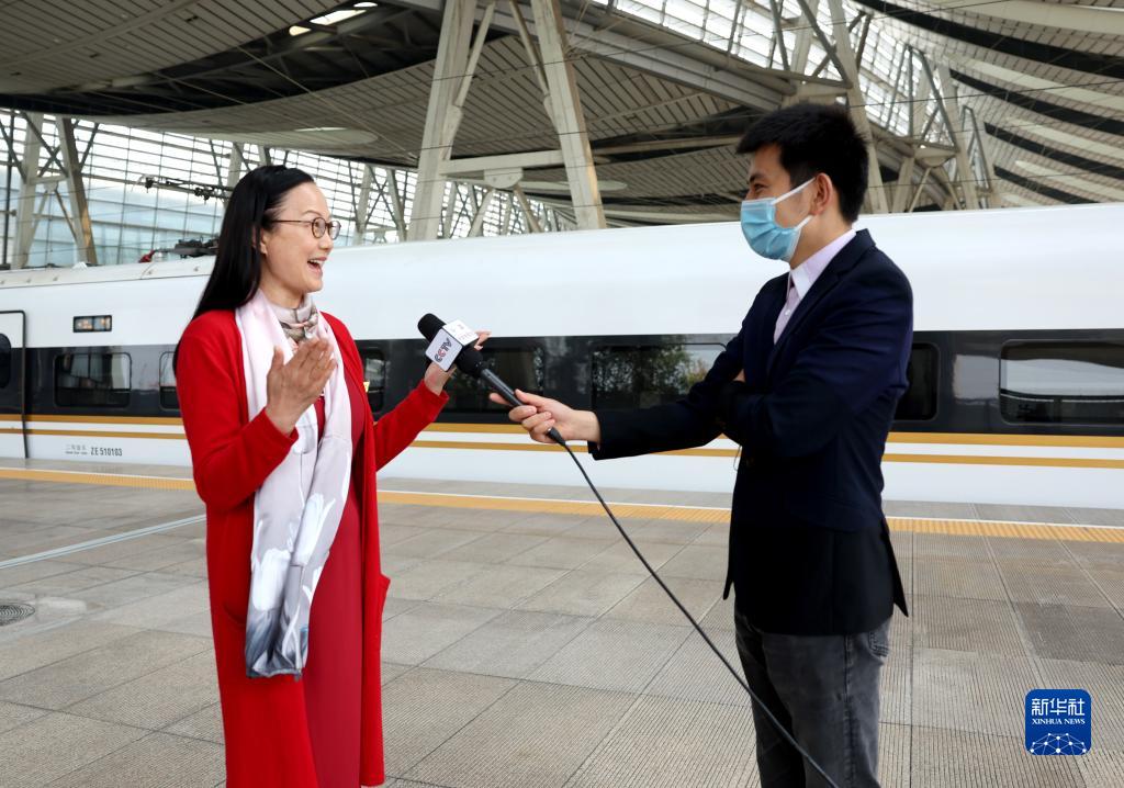 10月14日,來自江蘇省的黨的二十大代表乘高鐵抵達北京南站。這是郁霞秋代表(左)在接受記者采訪。