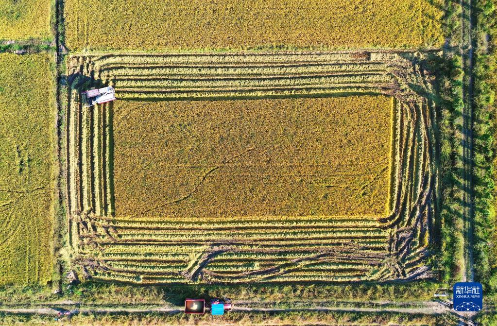 在江西省南昌縣大田農社,無人駕駛收割機收割成熟的水稻(10月11日攝)。