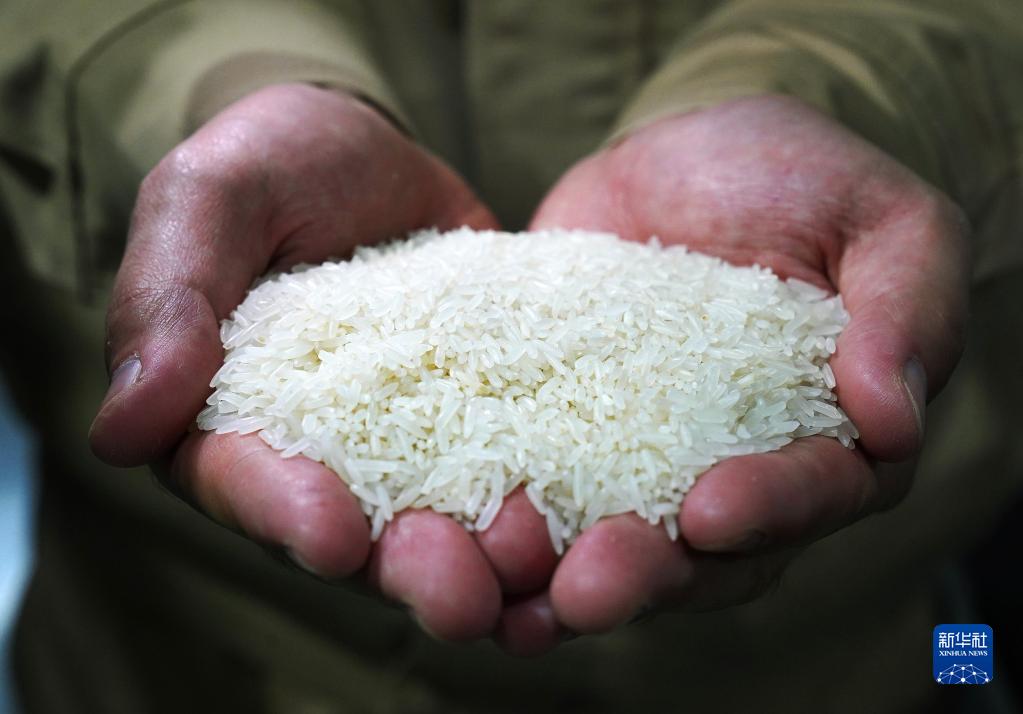 在位于江西省南昌縣的一個糧食加工工廠,工人展示加工后的大米(10月11日攝)。