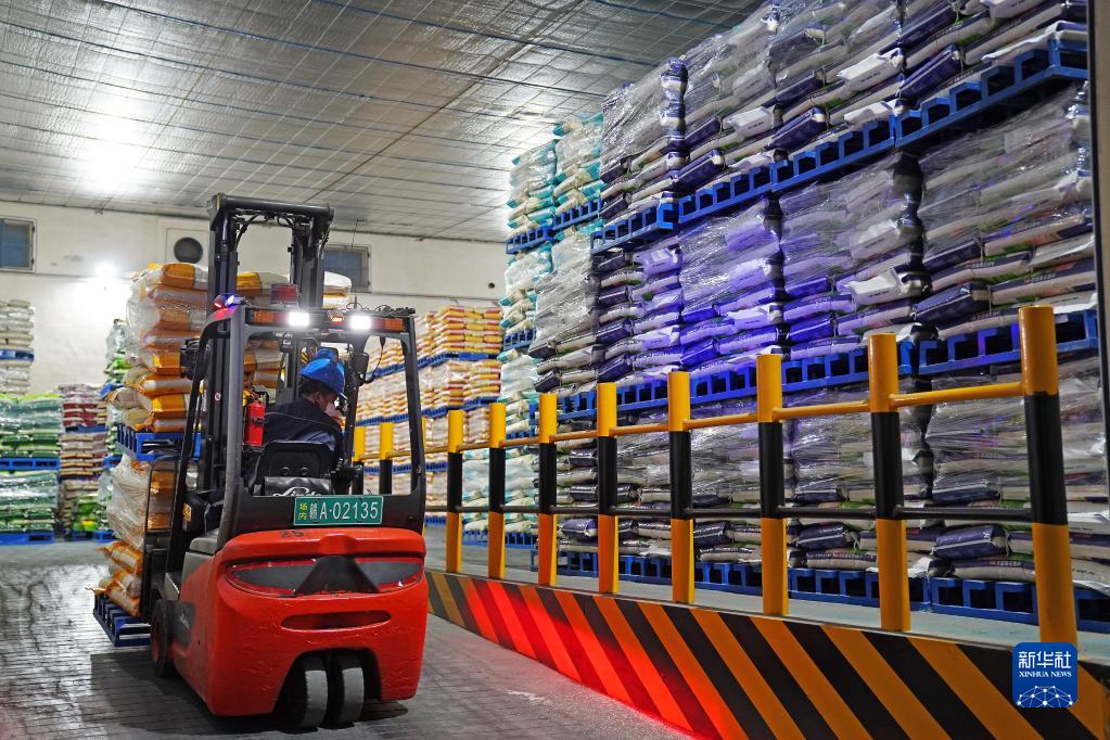 在位于江西省南昌縣的一個糧食加工工廠,工人將包裝好的大米出庫準備運往銷售點(10月11日攝)。