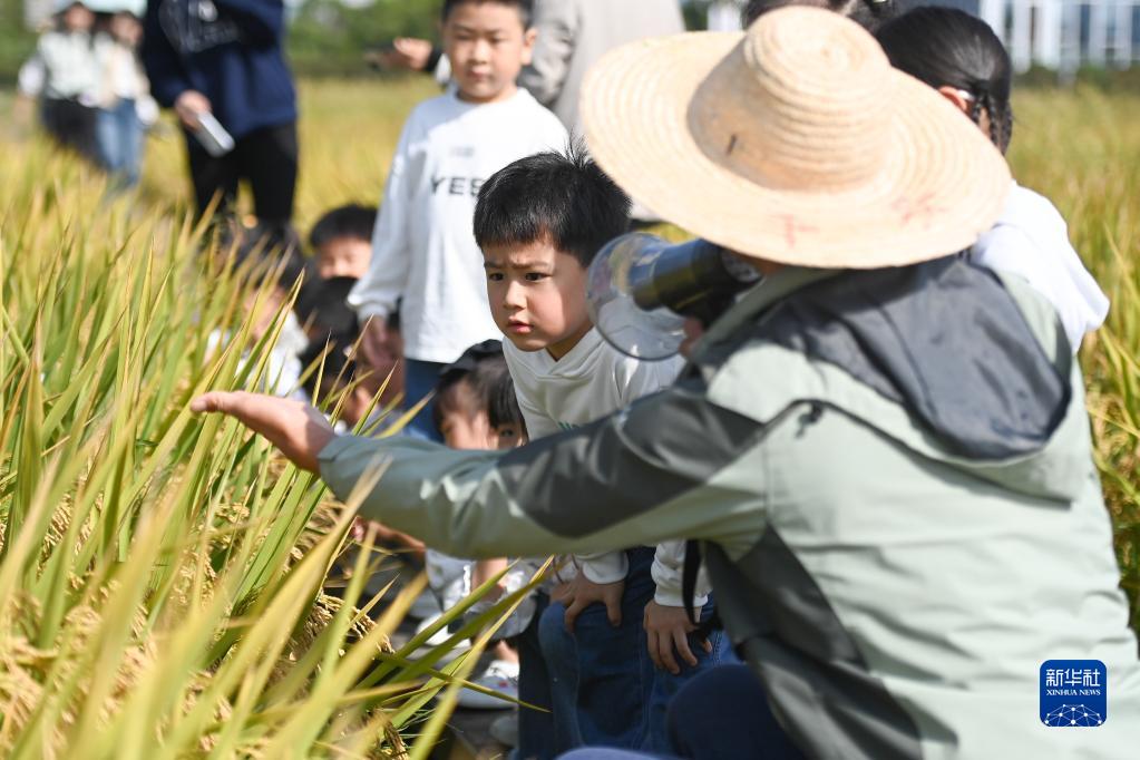 10月14日,浙江省湖州市吳興高新區靈糧農場的農技人員在稻田邊向小朋友介紹種糧知識。