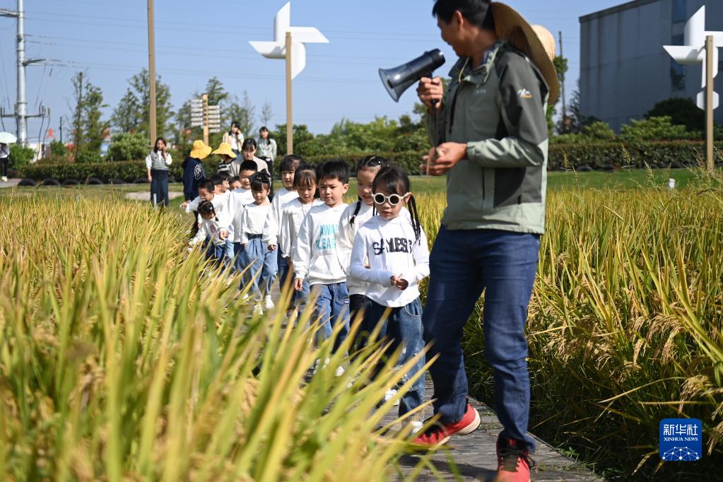 10月14日,浙江省湖州市吳興高新區靈糧農場的農技人員(右一)帶領小朋友參觀稻田,介紹種糧知識。