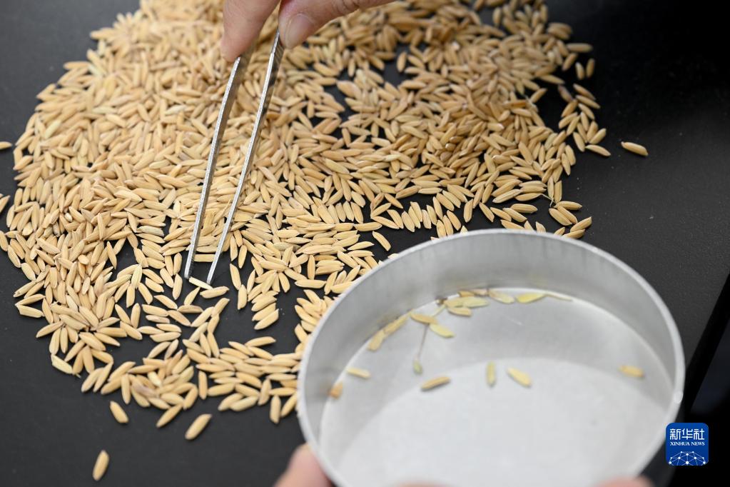 10月13日,在中央儲備糧合肥直屬庫有限公司本部,工作人員對等待入庫的稻谷進行檢測。