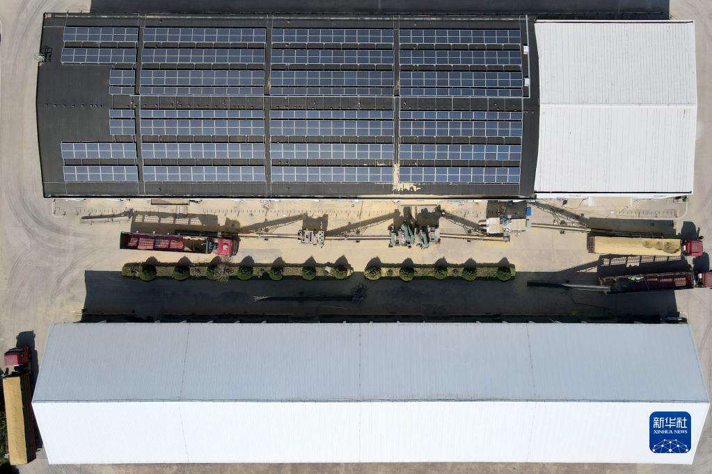 10月13日,在中央儲備糧合肥直屬庫有限公司本部,稻谷被傳送帶轉運至倉房內(無人機照片)。