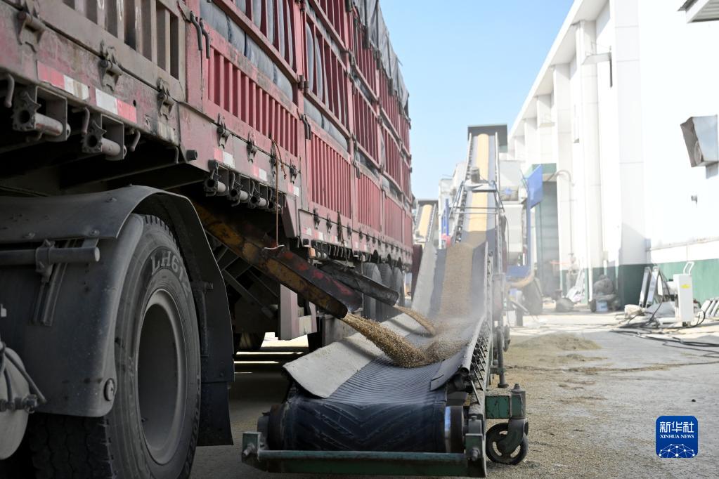 10月13日,在中央儲備糧合肥直屬庫有限公司本部,稻谷被傳送帶轉運至倉房內。