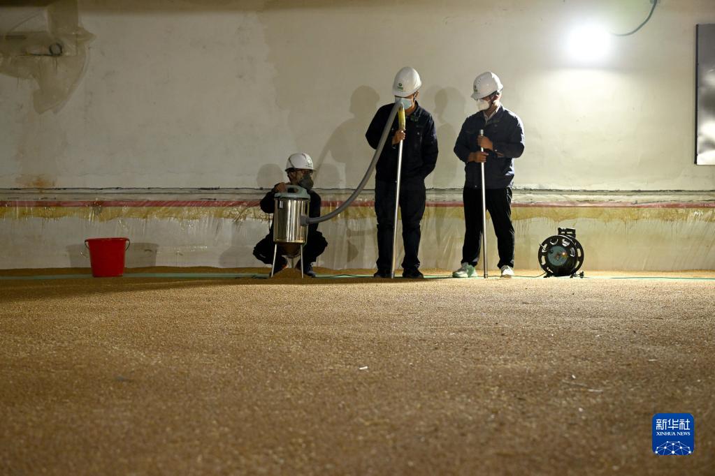 10月13日,在中央儲備糧合肥直屬庫有限公司本部,工作人員對倉房內的小麥進行取樣檢測。
