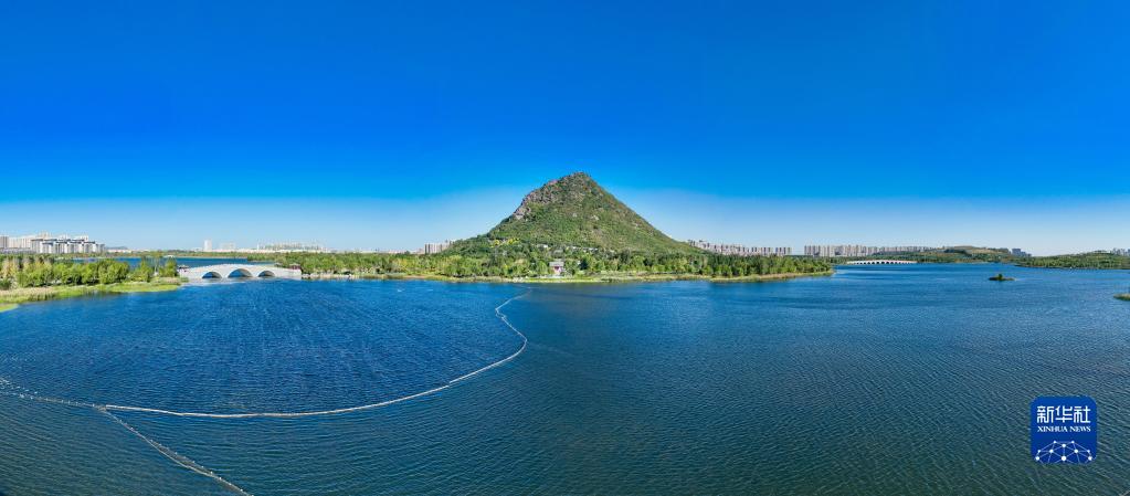 這是10月9日在山東省濟南市拍攝的晴空下的華山景區(無人機全景照片)。