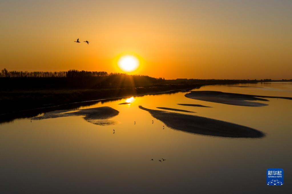 10月10日傍晚,水鳥在黃河下游山東高青段休憩、飛舞(無人機照片)。