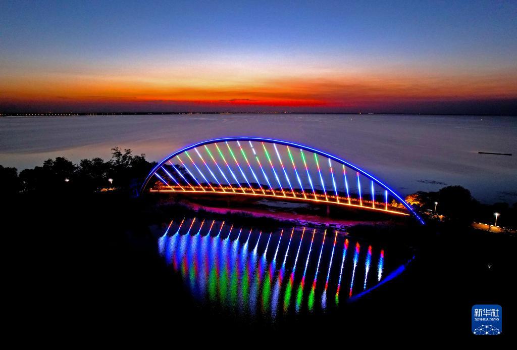 這是9月26日在江蘇省宿遷市拍攝的晚霞映照下的駱馬湖(無人機照片)。