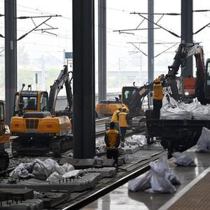 10月14日,施工者在天津西站操作機械設備進行換枕作業。