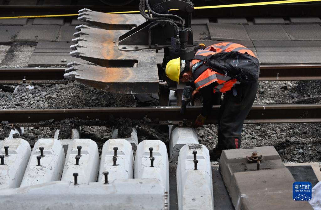 10月14日,施工者在天津西站對砼枕進行固定。