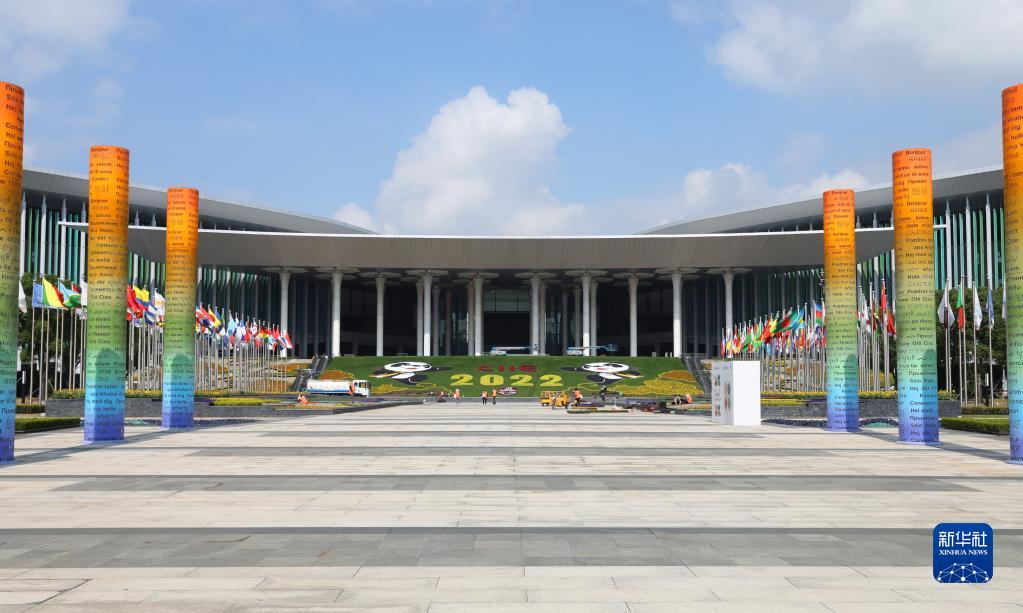 10月15日,在國家會展中心(上海)南廣場,園藝工人在進行鮮花裝飾工作。