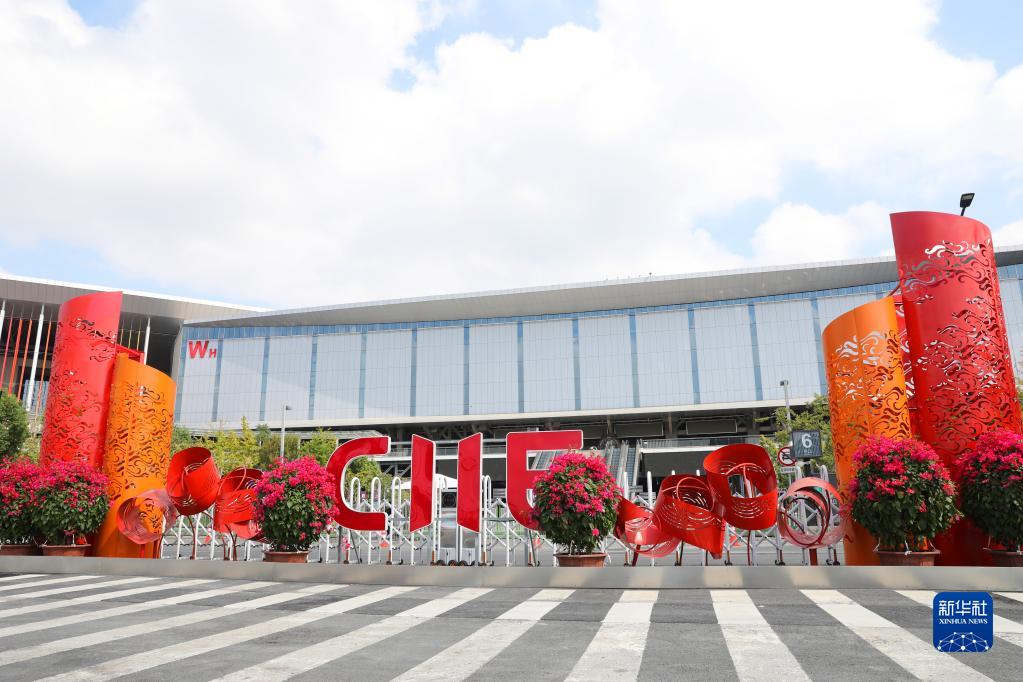 這是國家會展中心(上海)西入口外的進博會主題鮮花裝飾(10月15日攝)。