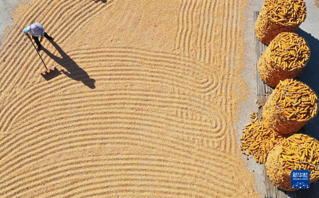 10月10日,山東省臨沂市郯城縣郯城街道農民在晾曬收獲的玉米(無人機照片)。