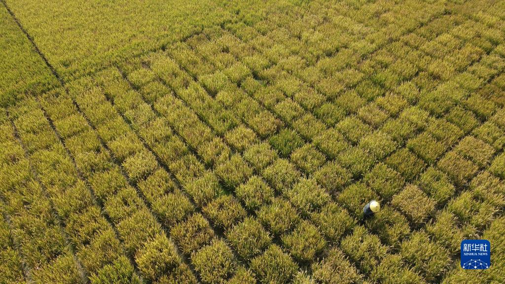 10月15日,在牛角大圩水稻試驗示范基地內,安徽省農業科學院水稻研究所工作人員夏加發在進行稻種收集(無人機照片)。
