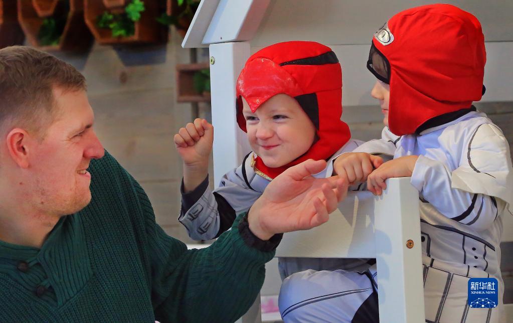 10月15日,在白俄羅斯明斯克,一對雙胞胎和家長在活動中嬉戲。