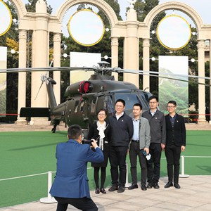 展廳內,與山東艦模型合影的觀眾絡繹不絕,體驗直升機綜合程序訓練器互動體驗裝置的觀眾也排起長隊;展廳外,觀眾們紛紛拍攝與無人機、直升機等裝備的同框照。