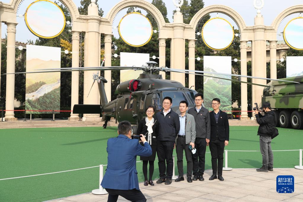 觀眾在“奮進新時代”主題成就展室外展區與直升機合影(10月12日攝)。新華社記者 許雅楠 攝