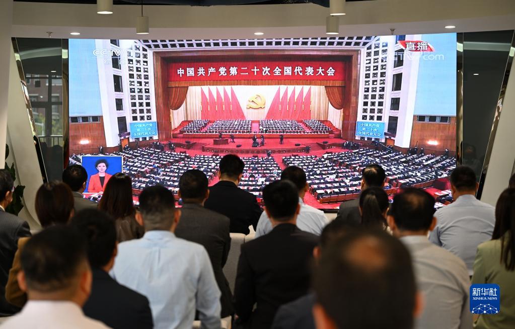 10月16日,在天津市濱海新區濱海-中關村科技園,企業員工在收看中國共產黨第二十次全國代表大會開幕會。