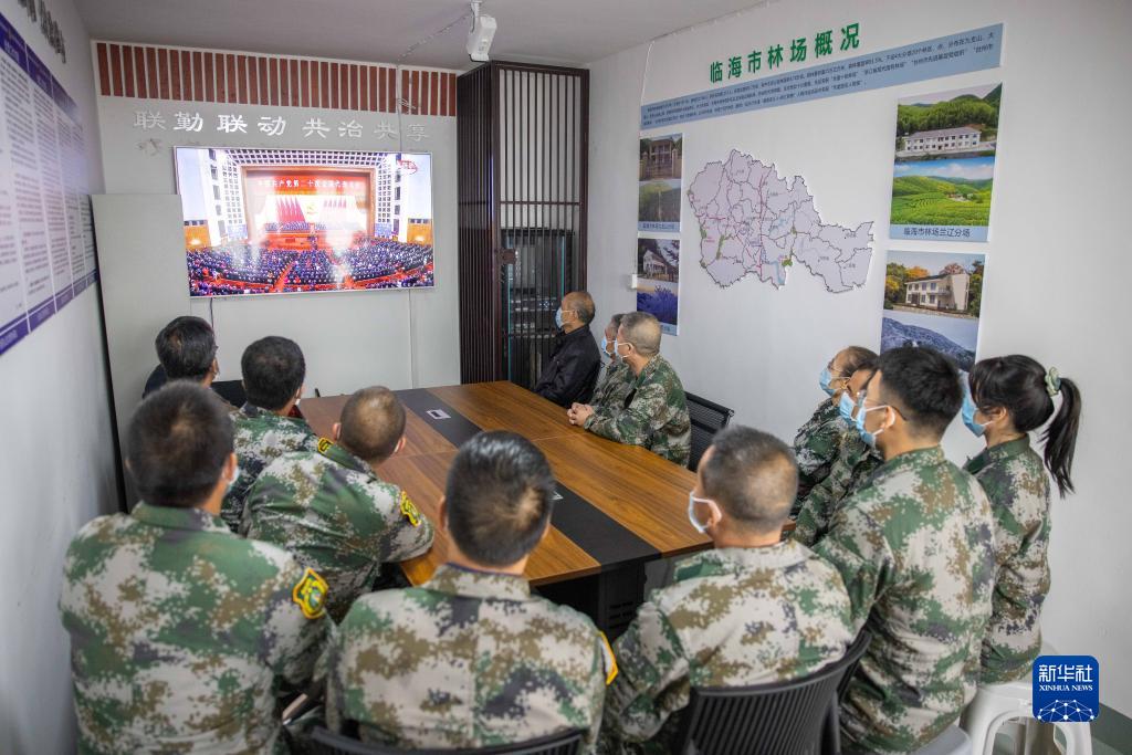 10月16日,浙江省臺州臨海市林場職工在位于括蒼山的林場內收看中國共產黨第二十次全國代表大會開幕會。