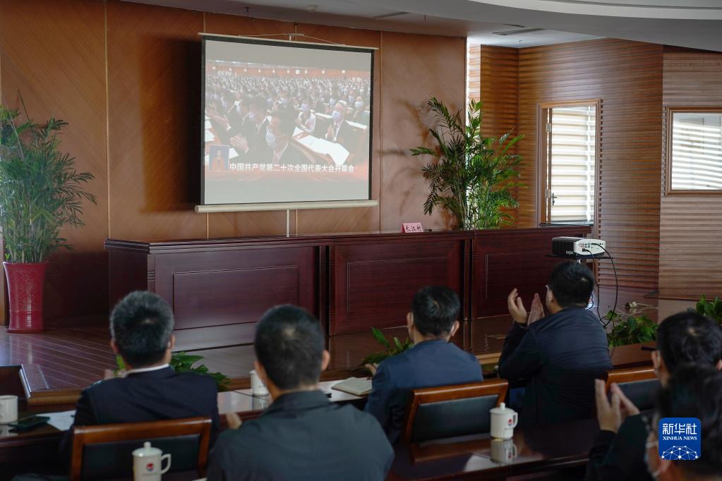 10月16日,江蘇省江陰市長江村黨員和村民代表在村委會會議室收看中國共產黨第二十次全國代表大會開幕會。