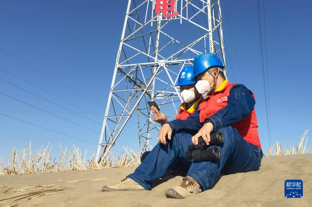 10月16日,在塔克拉瑪干沙漠中,新疆和田供電公司保電人員在巡視110千伏輸電線路途中,通過手機收看中國共產黨第二十次全國代表大會開幕會。