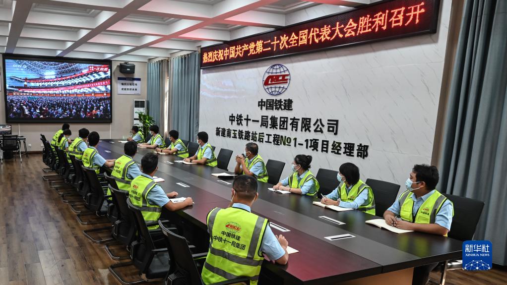 10月16日,廣西南玉鐵路玉林北站項目建設者在收看中國共產黨第二十次全國代表大會開幕會。