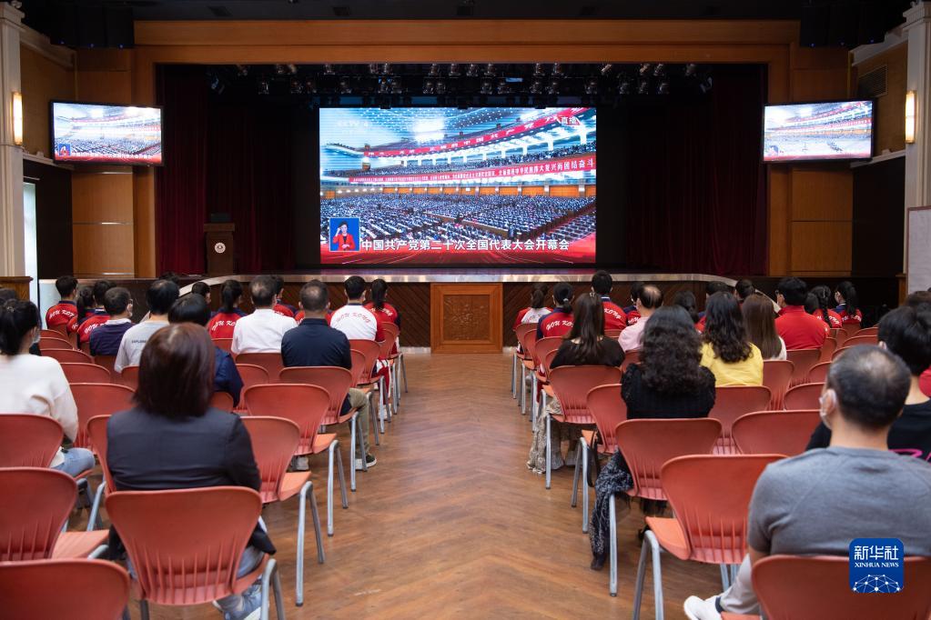 10月16日,在澳門濠江中學禮堂,師生收看中國共產黨第二十次全國代表大會開幕會。