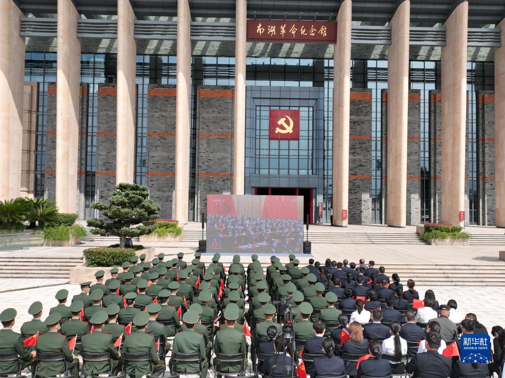 10月16日,武警浙江總隊嘉興支隊官兵在南湖革命紀念館前與工作人員一起收看中國共產黨第二十次全國代表大會開幕會(無人機照片)。