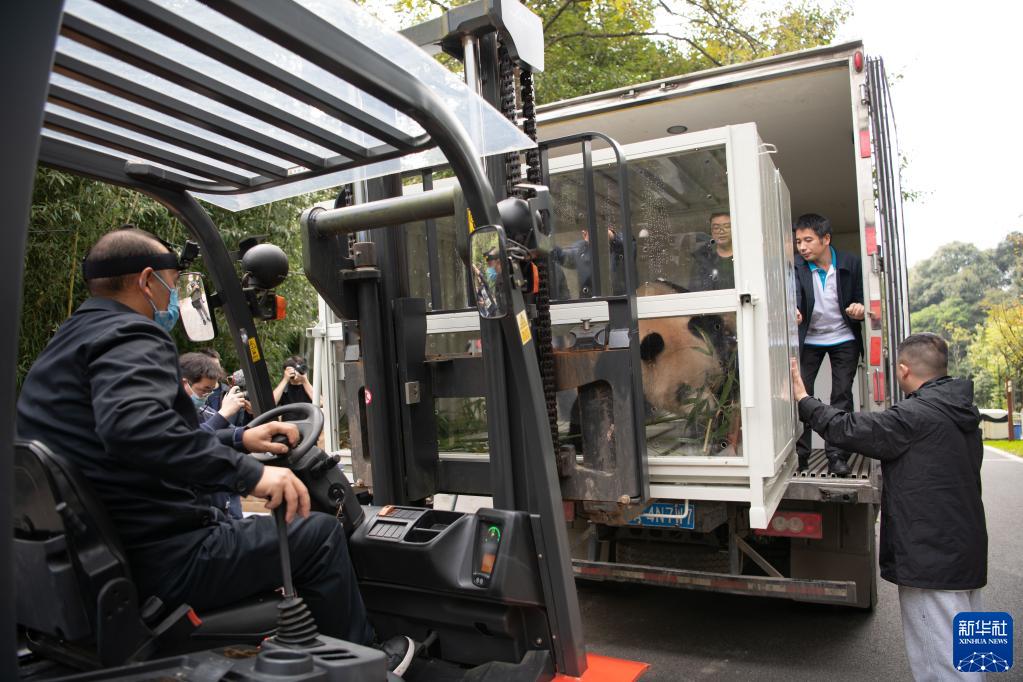 10月18日,在中國大熊貓保護研究中心雅安基地,工作人員將大熊貓“京京”轉移至車上。