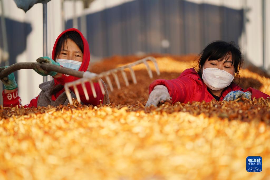 10月17日,在黑龍江省拜泉縣的鑫鑫菌業曬場,工人在翻曬滑子菇。